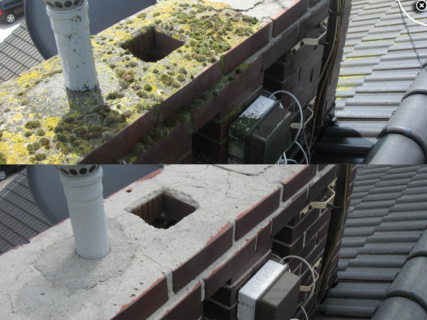 Czyścimy także kominy, które nierzadko są równie mocno porośnięte mchem. W końcowej fazie udrażniamy rynny.